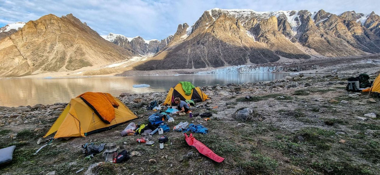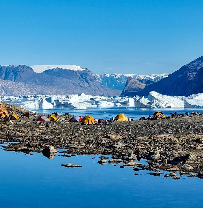 We established base camp in an extraordinary spot — a flat, sheltered area between the fjord and a small bay, surrounded by musk oxen, foxes, blueberry bushes, and the slow procession of icebergs drifting past. For a brief moment, it felt like paradise. Then the work began.