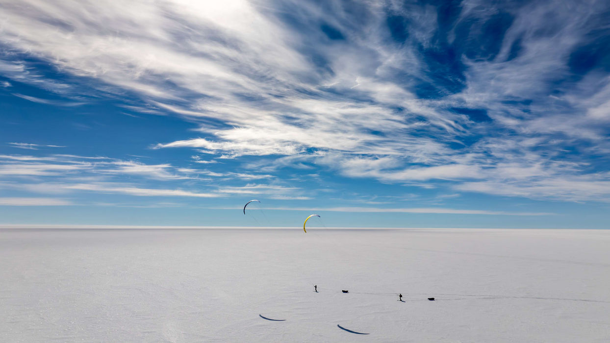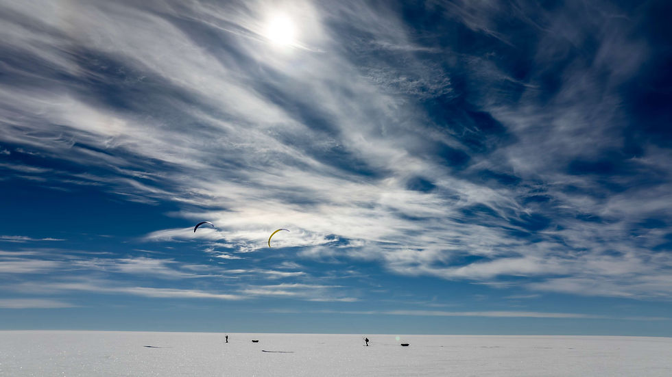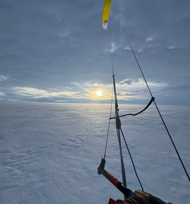 The snow surface was extraordinary. A thin layer of fresh snow over a firm base made for conditions as close to perfect for kite skiing as I can imagine — smooth, consistent, fast. The pulkas — our sleds, each carrying over a hundred and twenty kilos of equipment and supplies — glided behind us almost effortlessly. The world contracted to a few simple elements: wind, snow, horizon, and the constant attention required to keep the kite flying correctly.