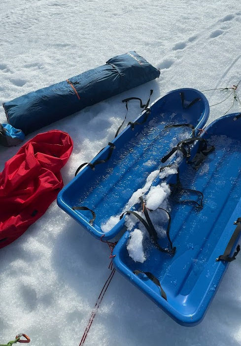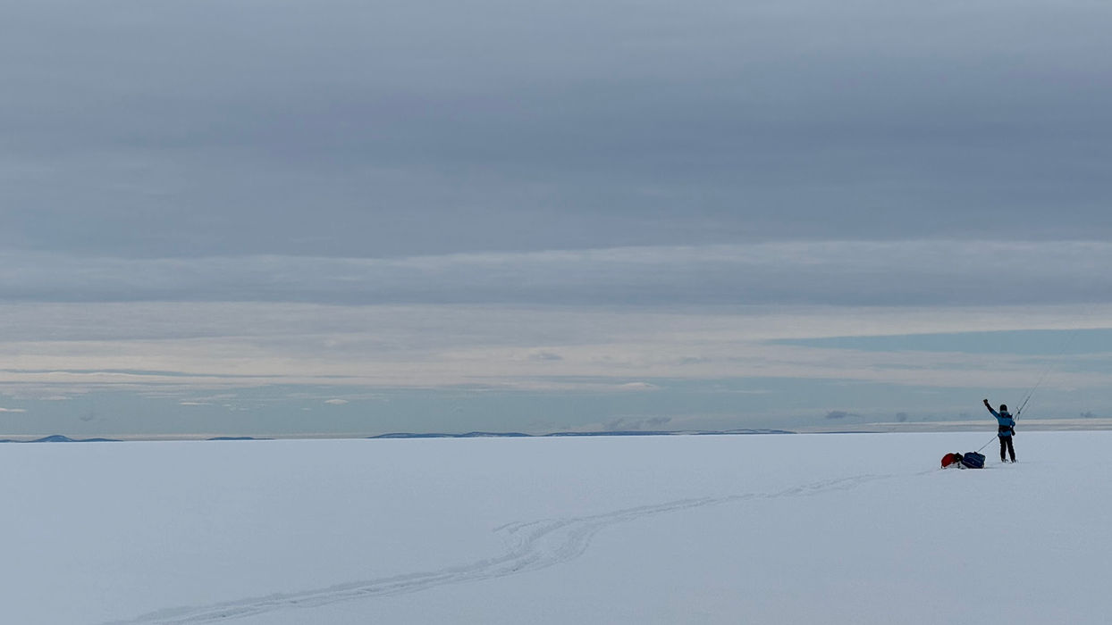 As we descended, the snow rapidly deteriorated. Firm ice gave way to slush, then to mush, thick and waterlogged, which dragged at the pulkas and made kiting increasingly precarious. The first crevasses appeared, then meltwater channels that had to be crossed carefully, one at a time. I made the decision on the last few kilometres to put the kite down and drag my skis by hand rather than risk a fall or injury so close to the finish — the kind of accident that happens at the end of expeditions, when concentration slips and fatigue takes over.