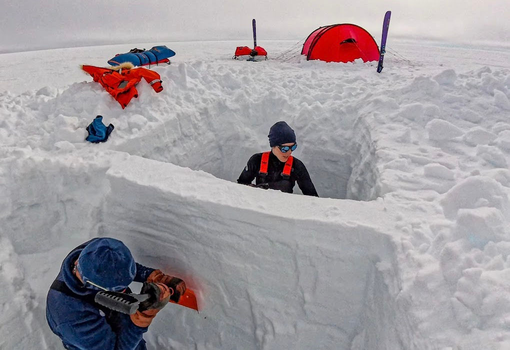 On one day when the wind dropped entirely, we stopped and worked. Matthieu and I dug a double snow pit — a side-by-side excavation that allows comparison of the snowpack structure across a small horizontal distance — recording the layering, density, and temperature of the snow at depth. We collected snow samples, which Matthieu melted and filtered on-site, preserving them for later black carbon analysis. In the silence of the windless ice sheet, the science felt very clear and very important: this is why we came.