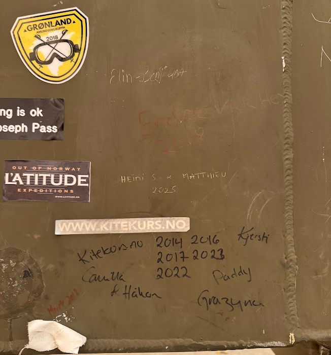 On one wall, we found messages left by previous expeditions. Among them was a message from Dixie Dansercoer, the Belgian polar explorer who made multiple kite-ski crossings of Greenland and Antarctica before his death in 2021. Reading his words, in that frozen building on the ice sheet he too had crossed by kite, was quietly emotional.