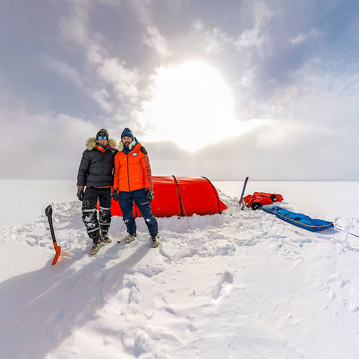 A boat could only reach us when the sea ice in the fjord had cleared enough to navigate. Our weather router Mark was sending daily forecasts, and friends at home — Nina and Yann among them — were monitoring satellite images of the ice conditions on our behalf. It could be a few days or a few weeks. We had food. We started shuttling equipment toward the coastline on foot, carrying 25 to 30 kilos at a time, covering two kilometres per carry and returning for more — quadruple carries, four times the distance walked.