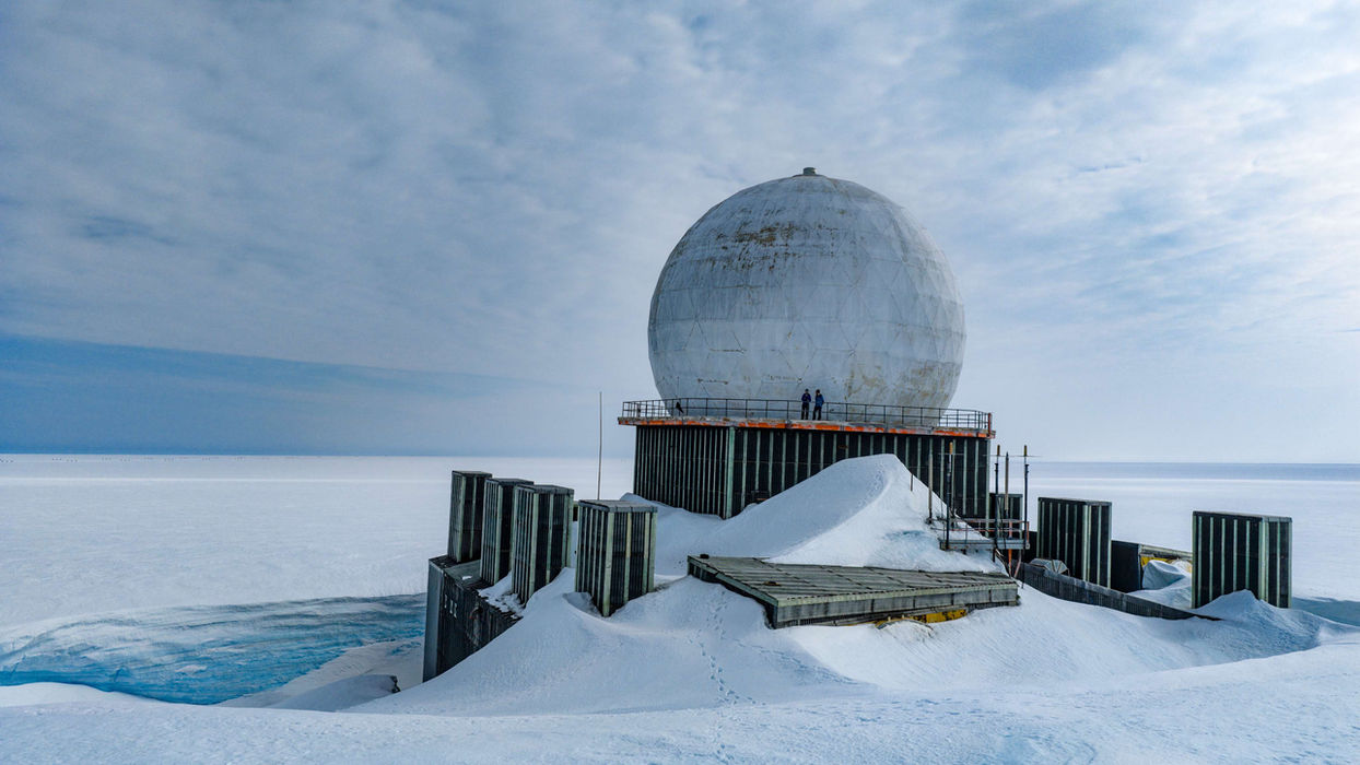 DYE-2 is a former United States Air Force radar station, built as part of the Distant Early Warning Line during the Cold War and abandoned in 1988. It sits on the Greenland Ice Sheet at approximately 2,100 metres elevation: a large elevated structure on stilts, rising from the flat white in complete isolation. Having kited through darkness for hours, seeing it emerge from the night sky was overwhelming. We were laughing. The dawn was just beginning to touch the horizon.