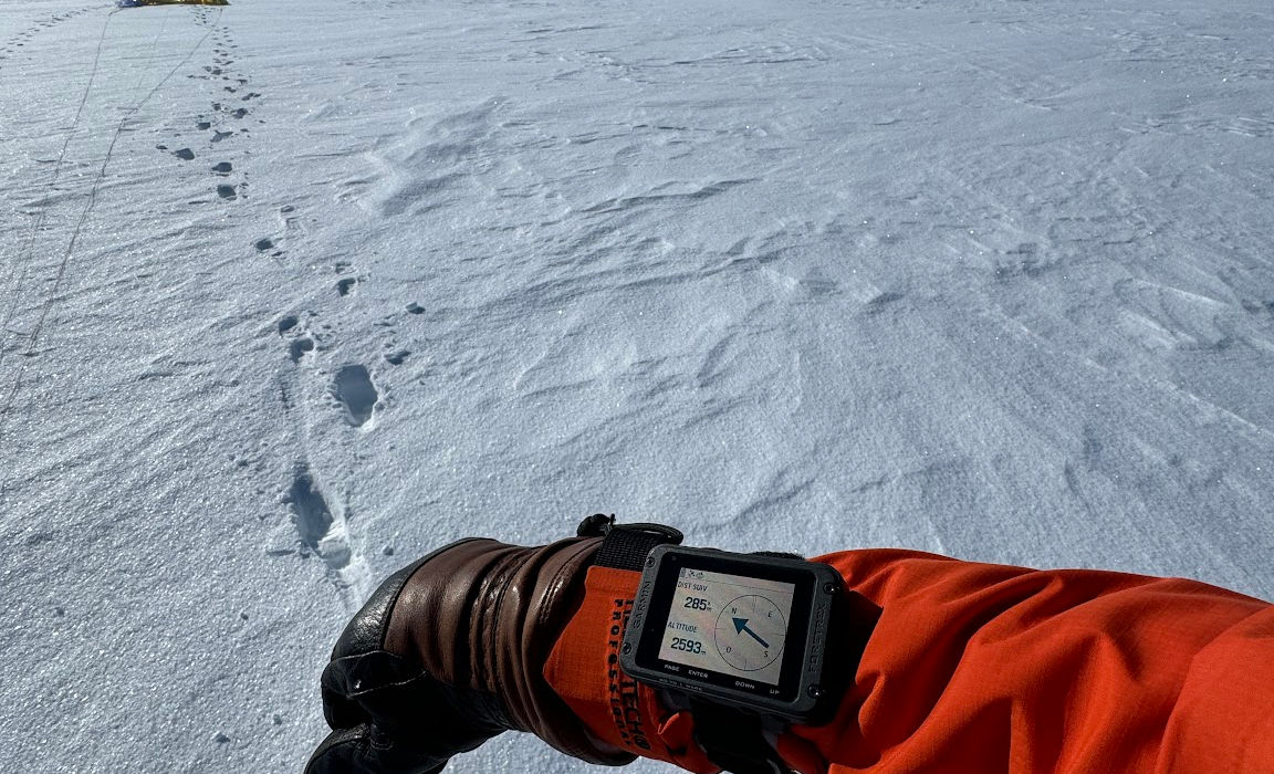 Before departure, Matthieu and I had defined waypoints carefully, tracing a narrow corridor of slower-moving ice that would allow us to gain altitude heading east as quickly as possible. We gave ourselves one firm rule: stay between 2,200 and 2,500 metres of elevation, where the ice is slower and the crevassing that characterises the lower margins of the glacier is left behind or buried under meters of snow.