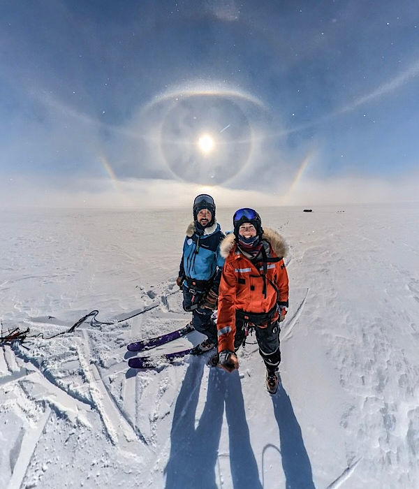 Solar halos are an optical phenomenon produced when sunlight refracts through ice crystals suspended in the atmosphere. On the plateau, under the right conditions, they form complete rings around the sun — luminous circles of light, sometimes accompanied by additional arcs and pillars, that can fill the entire sky. We stood and stared. It felt, out there with nothing around us for hundreds of kilometres in every direction, as though Greenland itself was looking back.